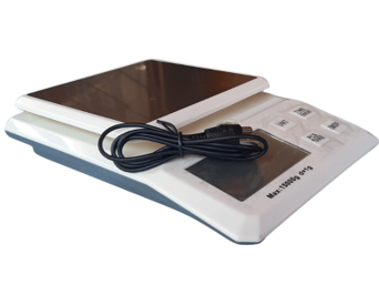 Se carga por medio de cable USB (pilas AAA opcional), duración de la carga 3 meses, plataforma de acero inoxidable, burbuja de nivelación, patas adherentes a la superficie, medidas 165x240x47.
